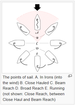 Point B: “close hauled,” which means sailing as close as possible into the wind. On B you “tack” the boat to change direction by turning the bow through the eye of the wind. If you are on starboard tack (wind coming from the right) you will end up on port tack (wind coming from the left).