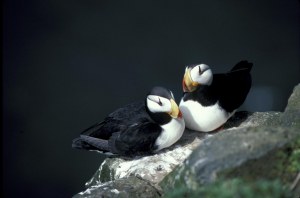 It was raining lightly the next morning. I put on my rain gear again and rode down to the ferry. We cruised along some cliffs as we left the harbor. There were hundreds of Puffins flying all around. Their dramatic coloring was quite a sight.