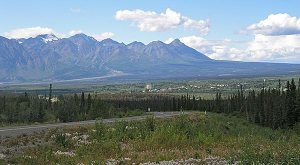 I stayed in Tok the next day to get set for 290 miles down the Alaska Highway to Haines Junction (population: 600). That little town is half the size of Tok, and there is not much in between. Best be prepared for that long, empty stretch. The biggest chore was fixing my tent. The zipper on the mosquito flap wouldn’t close anymore. The long hours of sunshine make central Alaska surprisingly hot in the middle of summer. There was no way I could sleep with the main flap closed.