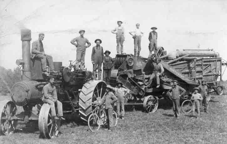 It took a crew of a dozen or more men and boys to thresh wheat or oats. Most of them were usually the farmer’s neighbors. They all came to your place to help thrash your crop, and you went to each of theirs in return. The wheat had already been cut and bound into sheaves. The crew brought the sheaves in on wagons, pitched them in the thresher’s maw, hauled the grain away, kept coal and water in the steam tractor, etc. My dad was the (young) man in charge. He used to say, “I’ve done every job on a threshing crew except cook and wash dishes.” (Women and girls were working in the farmhouse to keep the men fed and watered.)